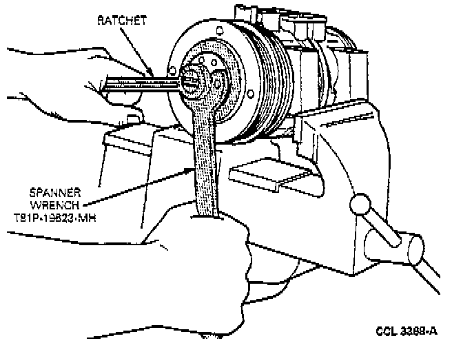 1. Remove the clutch hub retaining nut. Use Spanner Wrench T81P-19623-MH or equivalent, if necessary.