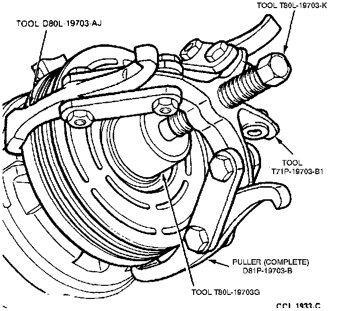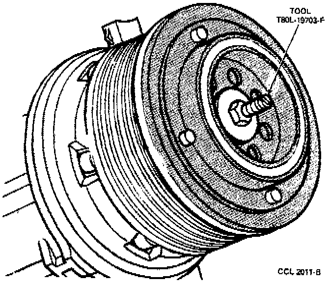 4. Pull the pulley and bearing assembly from the compressor. If the pulley and bearing assembly cannot be removed by hand, use the Shaft Protector T80L-19703-G and the Pulley Puller D81P-19703-B or T71P-19703-B or equivalent to remove the pulley.