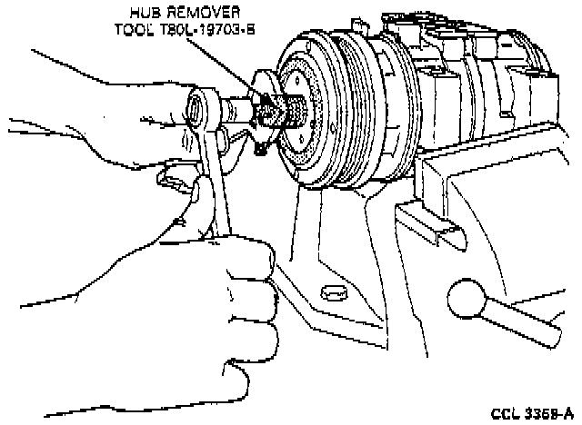 2. Remove the clutch hub and shims from the compressor shaft with the Hub Driven Plate Remover T80L-19703-B or equivalent. Hold the tool with a 1-inch wrench and tighten the bolt with a 1/2-inch wrench to pull the hub from the compressor shaft.