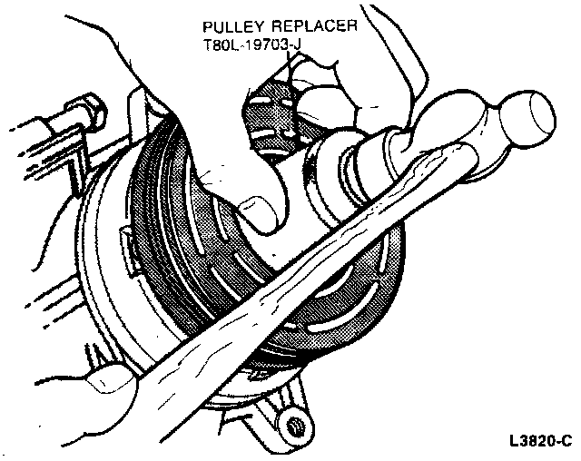 2. Install the pulley and bearing on the compressor. The bearing is a slip fit on the compressor head and, if properly aligned, it should slip on the compressor head. If difficulty is encountered installing the pulley, gently tap the pulley on the compressor using the Pulley and Bearing Tool T80L-19703-J. Ensure the pulley bearing is aligned with the compressor head.