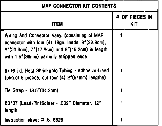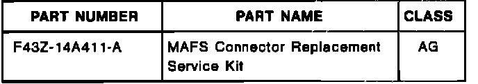 Perform normal inspection and diagnosis. Refer to the Powertrain Control and Emissions Diagnosis Service Manual (PC/ED), Section 2A. If the root cause cannot be determined, (1) cut off the MAF connector and replace it with a new MAF Connector Service Kit, featuring an improved connector and pigtail assembly. (2) Strain-relieve the connector by tie strapping the harness to the MAF casting. Refer to instruction sheet I.S. 6525 (included with each kit) for service details.