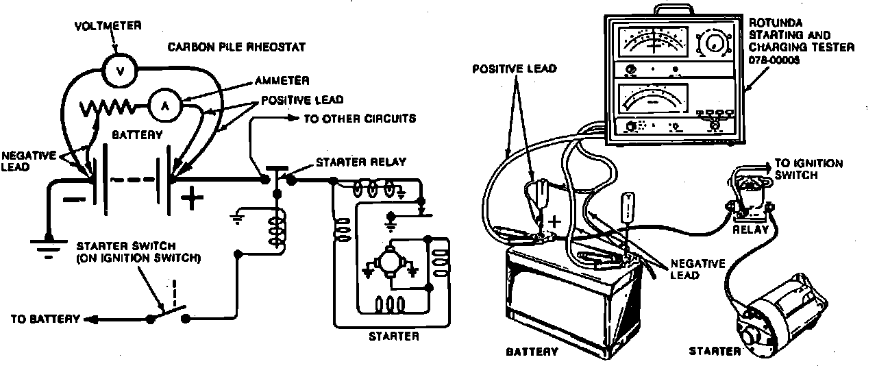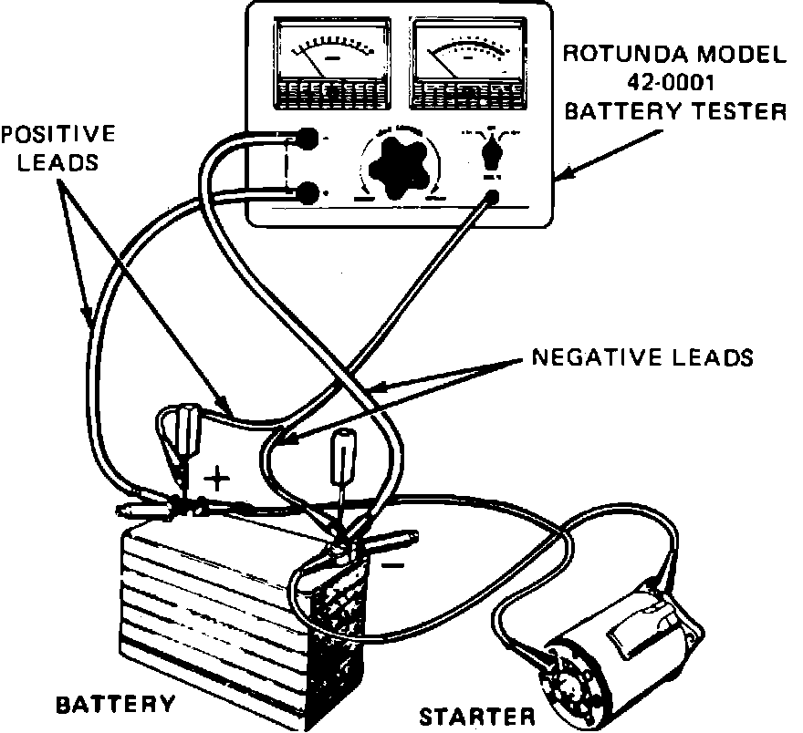 4. Stop cranking engine and reduce resistance of carbon pile until voltmeter indicates same reading as that obtained while starter cranked engine. Ammeter should read 150-250 amps.