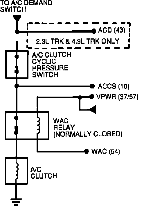 When the A/C demand switch is turned on and the Cyclic Pressure switch/Low Pressure Switch is closed, voltage passes through the normally closed WAC relay to the A/C clutch. Under certain conditions the EEC-IV processor can interrupt this voltage, turning off the A/C. To do this, the EEC-IV processor will ground the WAC output (Pin 54), which will energize the coil in the WAC relay. This will result in the normally closed contacts opening, interrupting the voltage supply to the A/C clutch