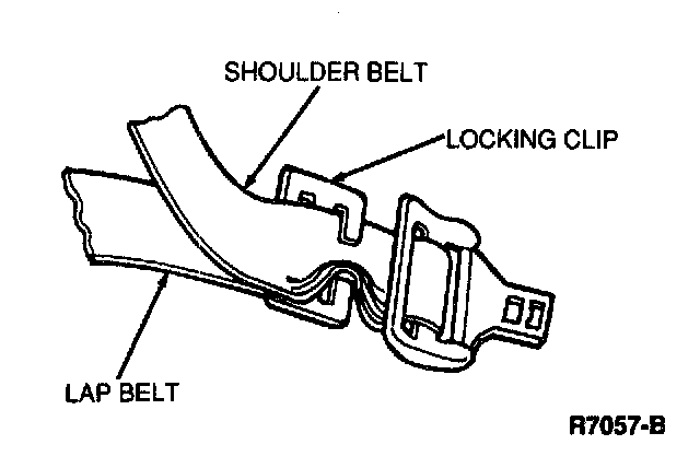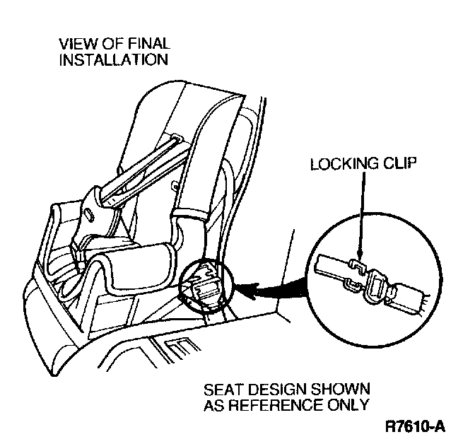 The locking clip must be used to secure a child seat when the vehicle has a shoulder and lap belt with a sliding tongue. Every safety belt that requires a locking clip is identified on the belt, with the label as shown in the illustration provided. The locking clip is installed on a sample piece of webbing to show proper installation.
