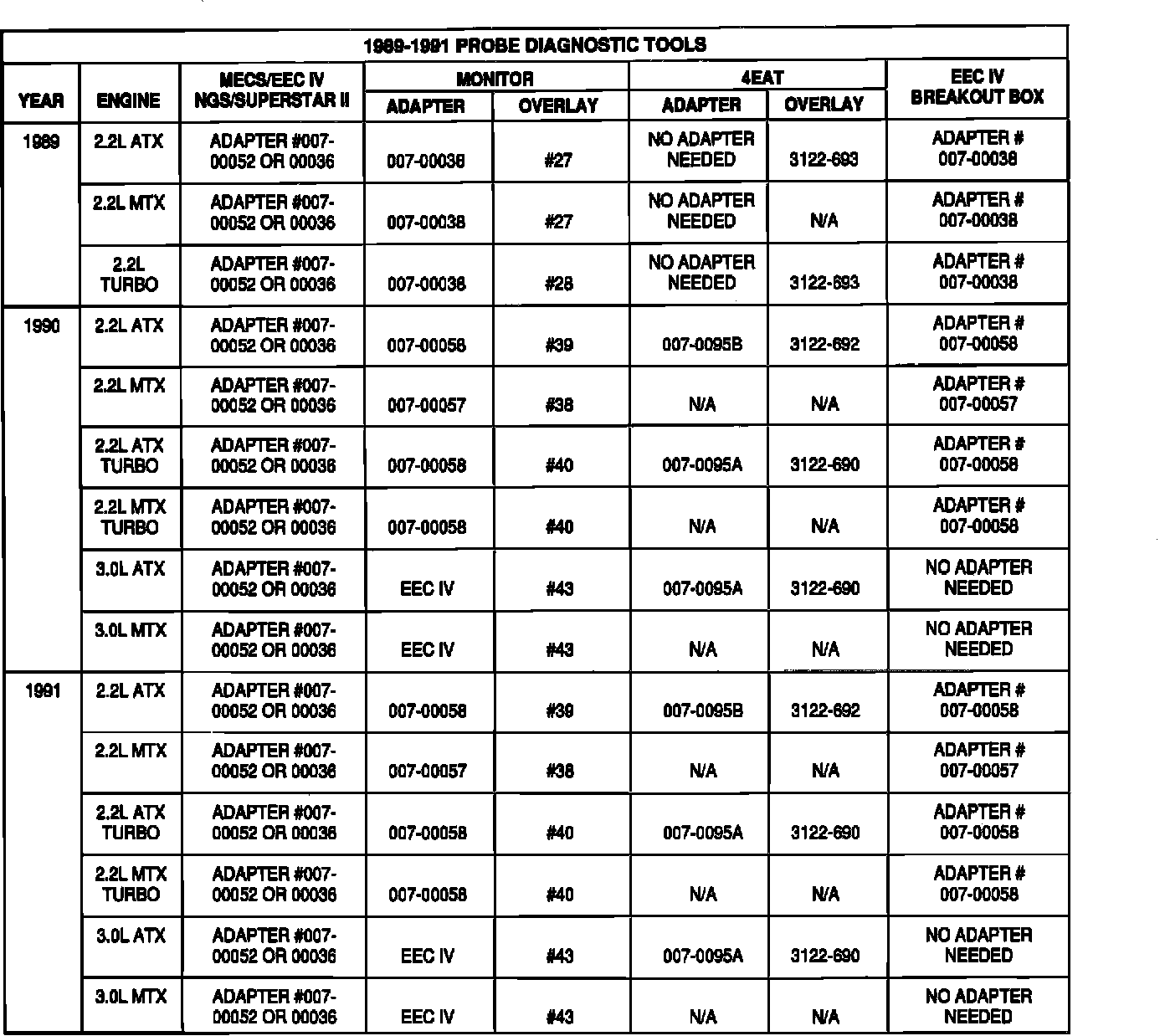The diagnostic tools and breakout box adapter applications for the vehicles listed above are not easily found in the Service or Powertrain Control/Emissions Diagnosis Manuals.