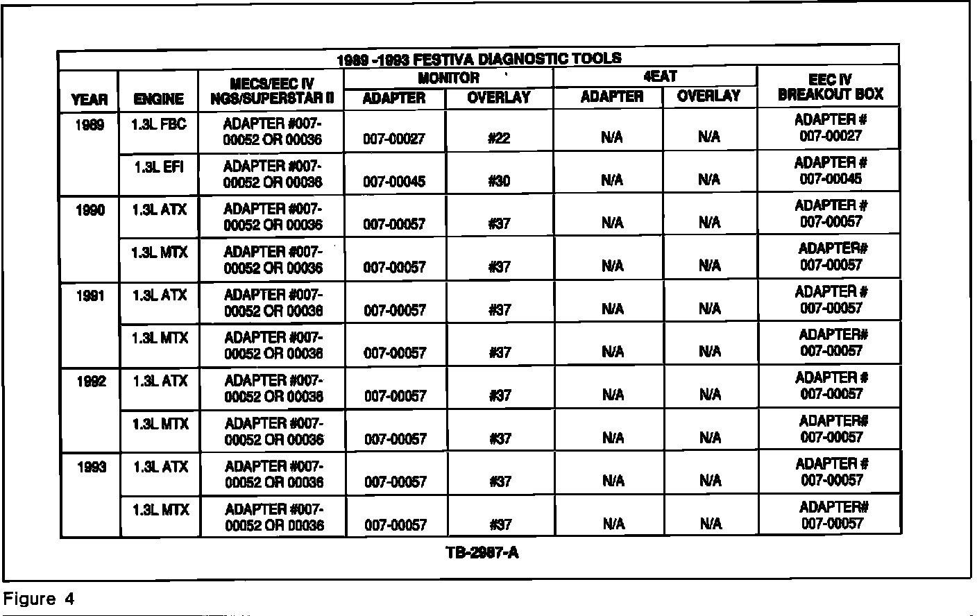 Refer to Figures 1-5 for a list of the diagnostic tool applications listing the model, year and engine transaxle combinations. Refer to Figures 6-11 for descriptions and instructions for connecting various breakout box adapters.