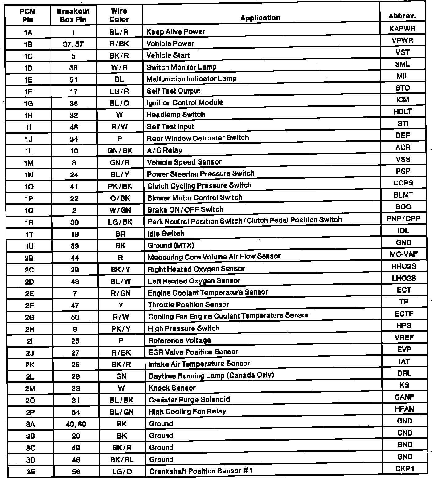 PCM Connector Pin Chart (Part 1, M/T):