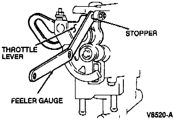3. Insert a 0.15 mm (0.006 inch) feeler gauge between the stopper and the throttle lever.