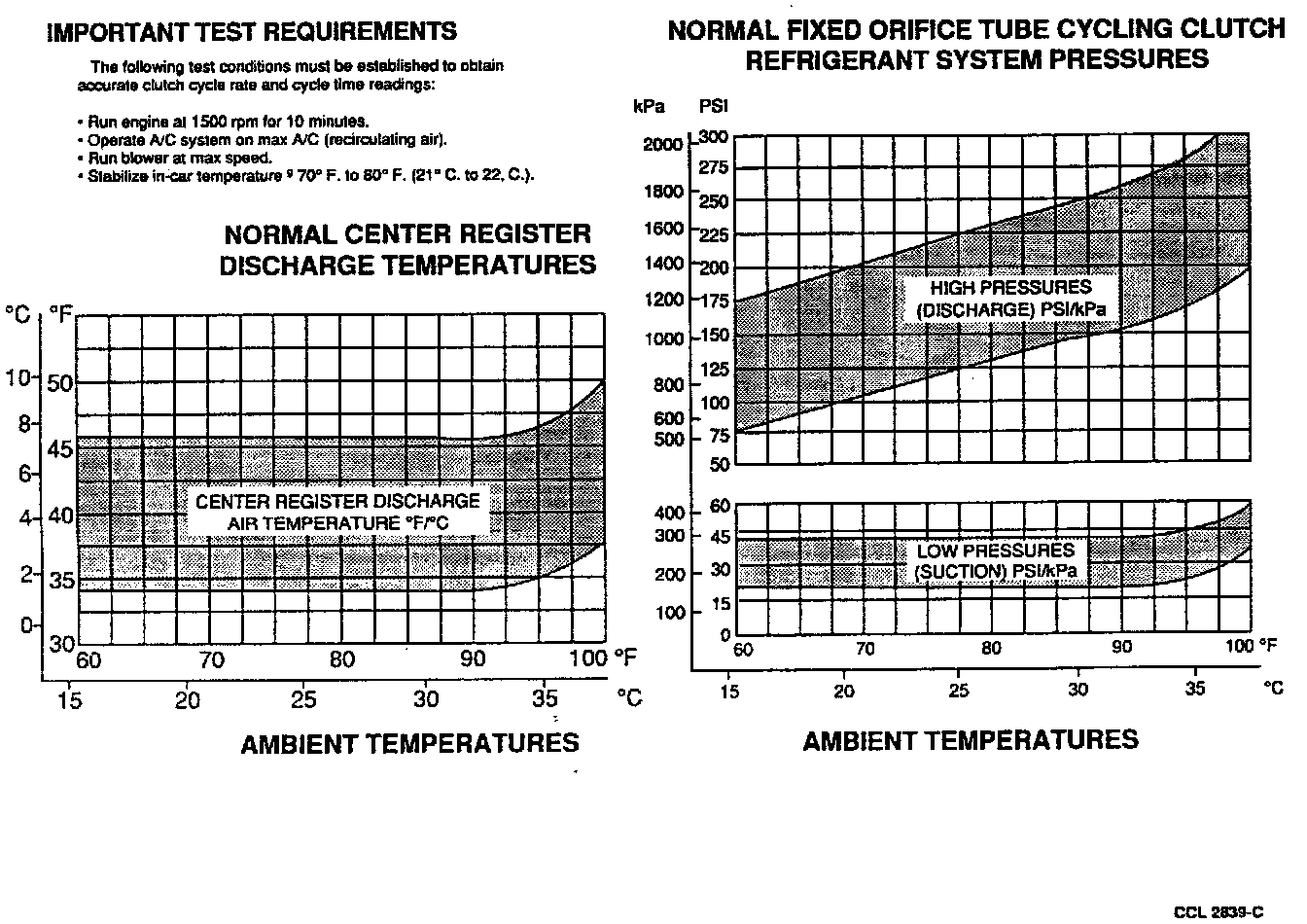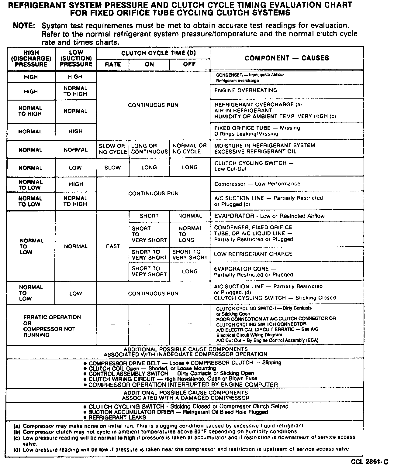 The best way to diagnose a condition in the refrigerant system is to note the system pressures (shown by the manifold gauges) and the clutch cycle rate and times. Then, compare the findings to the Refrigerant System Pressure Temperature Relationship and the Refrigerant System Clutch Cycle Timing Rate charts.