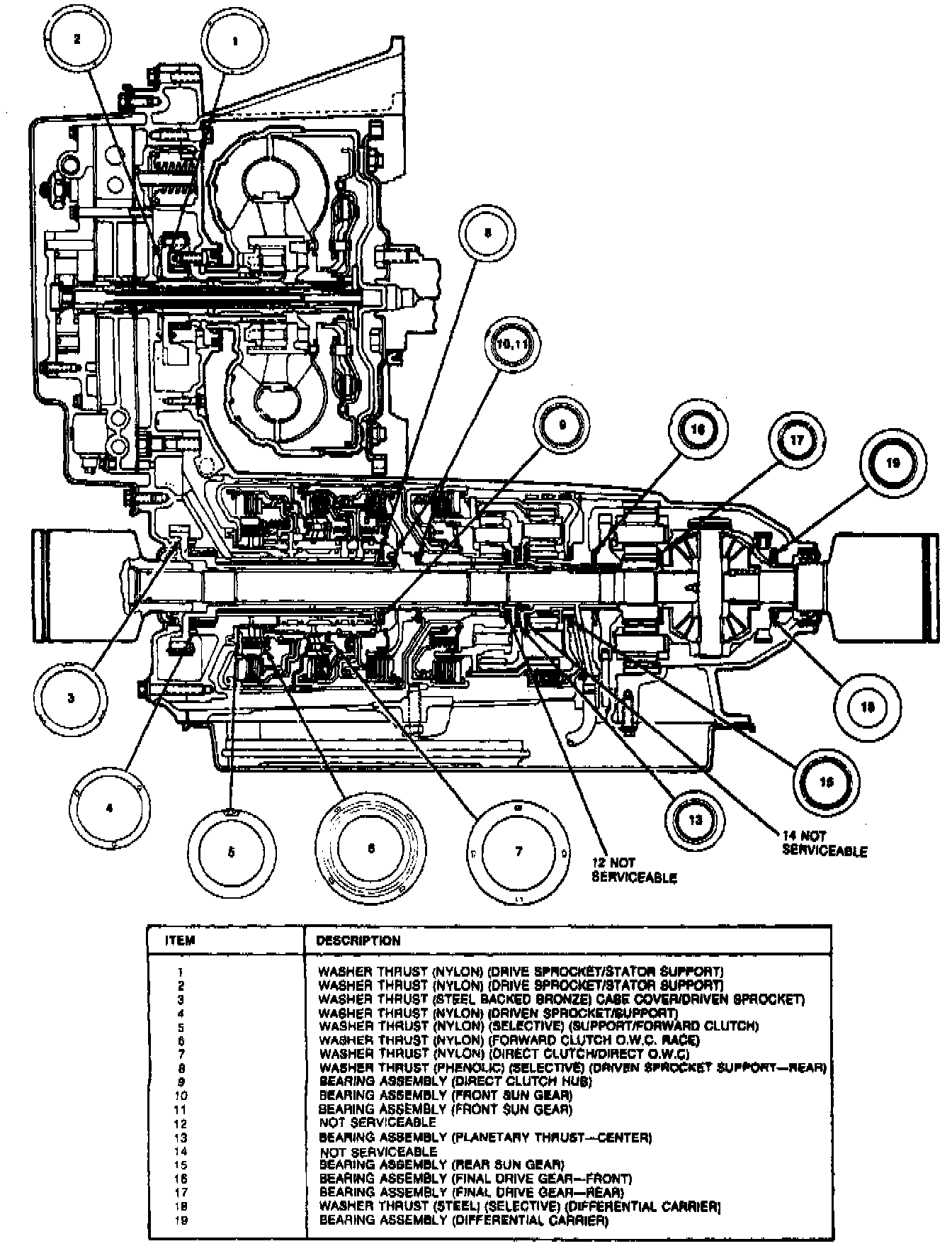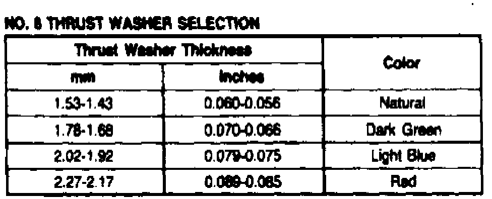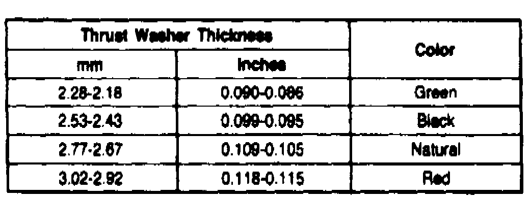 d. If clearance is not within 0.004-0.025 inch, replace selective thrust washer. Thrust washers are available in the following thicknesses: 0.056-0.052 inch red; 0.059-0.055 inch green; 0.062-0.058 inch blue; 0.064-0.060 inch black; 0.067-0.063 inch white; 0.069-0.065 inch brown; 0.072-0.068 inch gold.