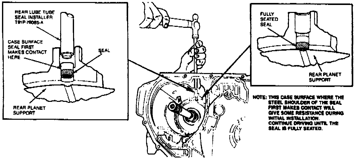10. Install new rear lube tube using rear lube tube tool No. T91P-76085-A or equivalent, drive in seal until makes firm contact with rear support.