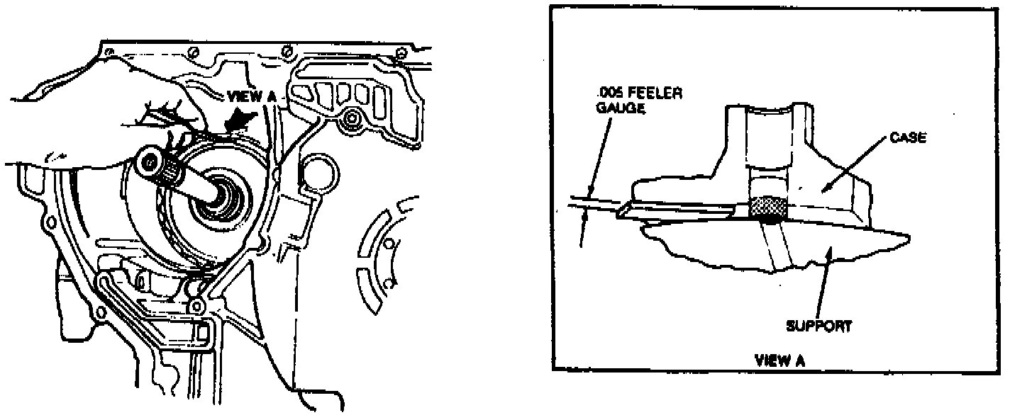 11. Using suitable 0.005 feeler gauge, measure clearance between case and rear support through snap ring opening, if gauge passes between seal and rear support, seal is not fully seated, repeat step 10.