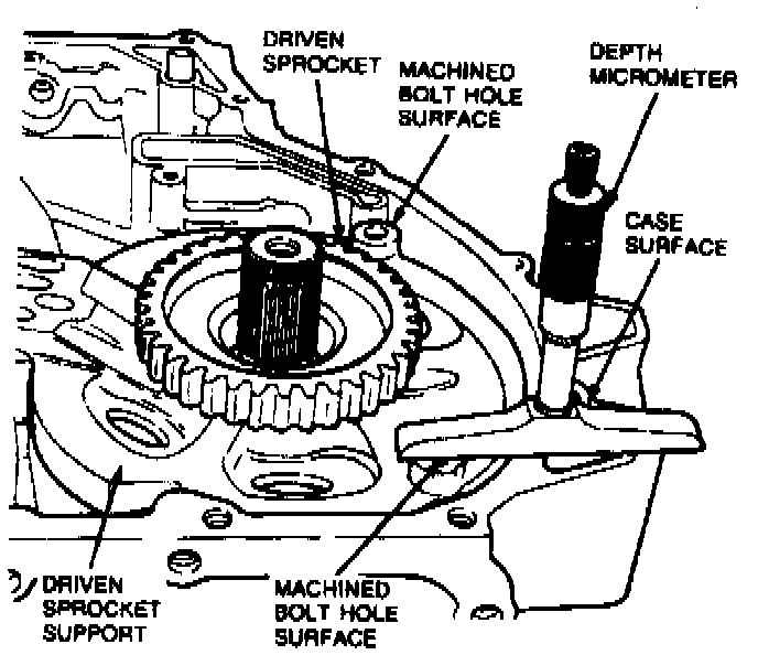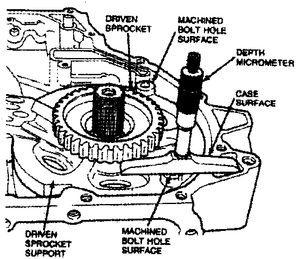 g. If machined bolt hole surfaces are below case machined surface, position depth micrometer as shown in the No. 5 And No. 8 Thrust Washer Clearance Measurement image. Measure distance to driven sprocket support machined surfaces and determine average from both readings. If reading is greater than 0.018 inch, refer to the No. 5 Thrust Washer Selection Chart, to determine correct washer. Install correct washer, repeat measurement and record reading.