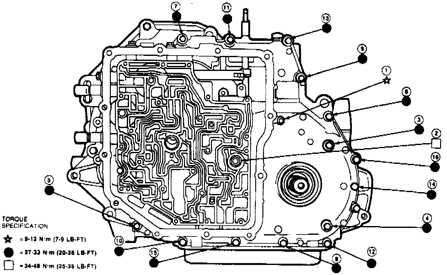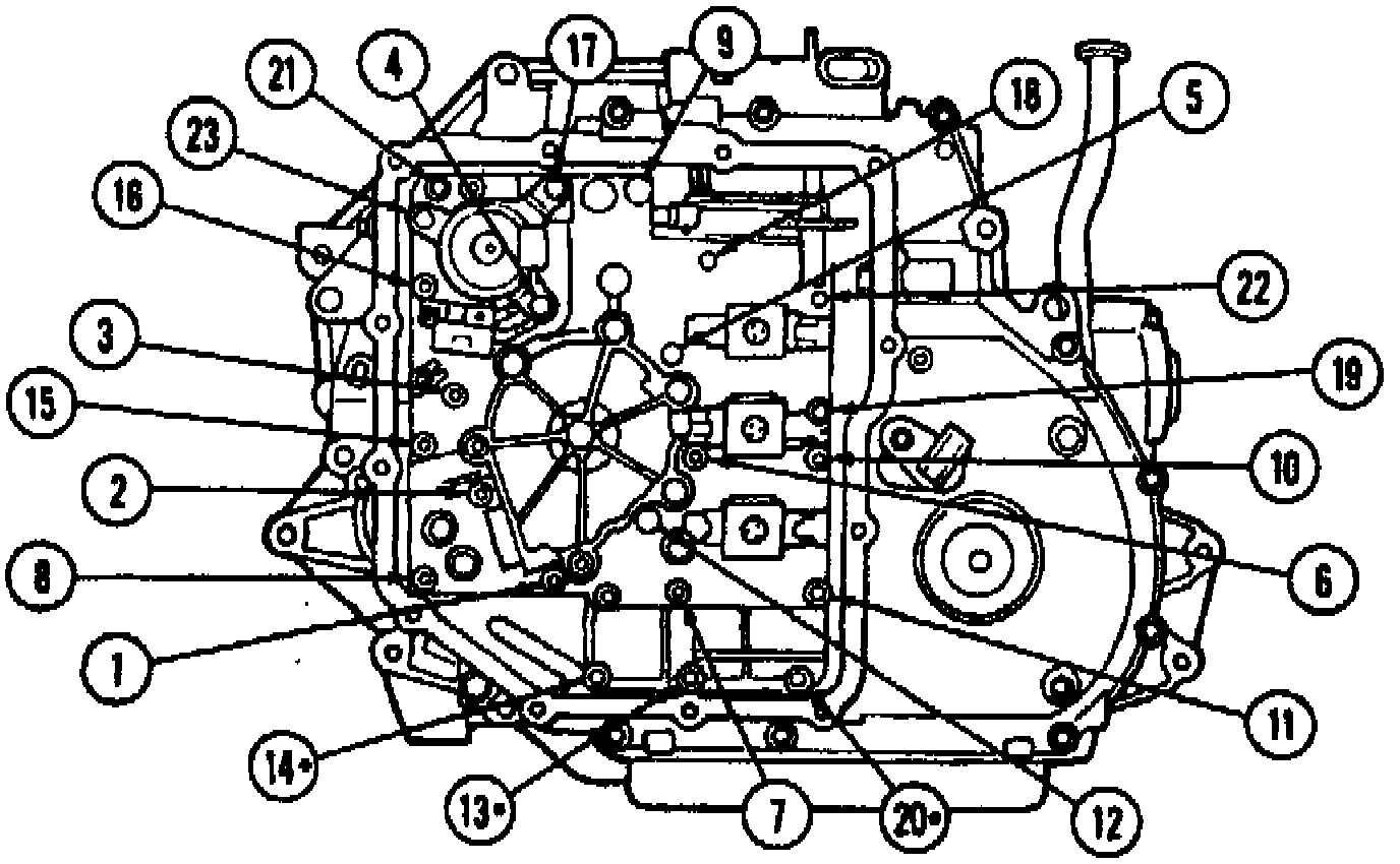 55. Install 22 valve body attaching bolts and tighten in the sequence shown in the Valve Body Bolt Tightening Sequence image.