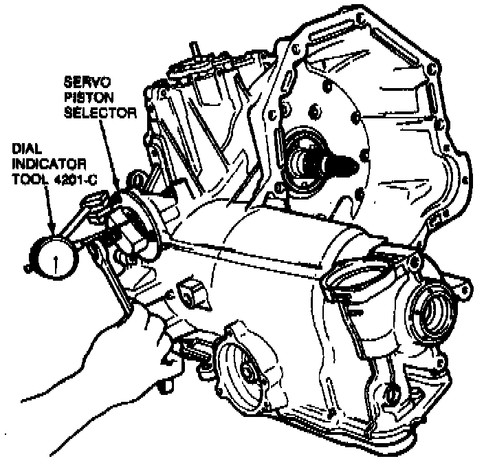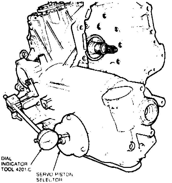 e. Zero dial indicator, then back off gauge disc screw until piston movement stops. Note indicator reading. The amount of piston travel indicated on the dial indicator will determine the rod length to be installed. Reading should be 0.070-0.149 inch for overdrive servo, 0.216-0.255 inch for low-intermediate servo if old band is used or 0.196-0.236 for low intermediate servo if new band is used.