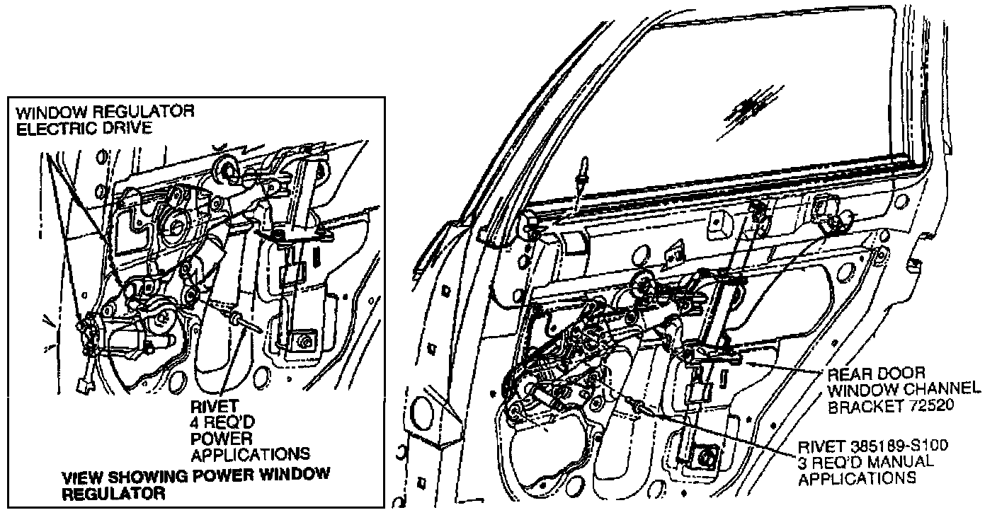 2. Install rivets using Heavy Duty Riveter D80L-23200-A or equivalent, or 1/4-20 x 1/2-inch screw and washer assemblies and 1/4-20 nut and washer assemblies to secure regulator mounting plate to door inner panel. Equivalent metric retainers may be used.