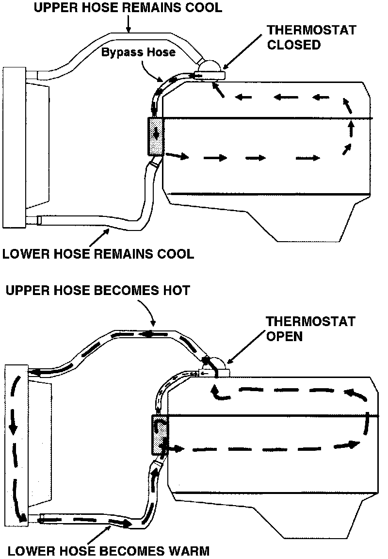 NOTE: A normally operating thermostat does not control the upper limit for coolant temperature. The maximum temperature is controlled by the amount of air flow drawn across the radiator.