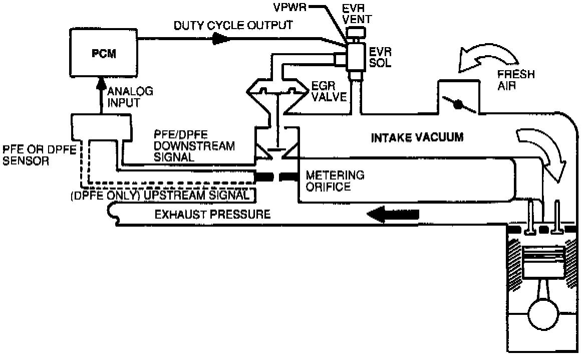 The Pressure Feedback EGR (PFE) system consists of a pressure sensor (PFE sensor), EGR Vacuum Regulator (EVR) solenoid, and a vacuum actuated EGR valve. The Differential Pressure Feedback EGR (DPFE) system uses a differential pressure sensor (DPFE sensor) which has two pressure inlets rather than one as in the PFE system.