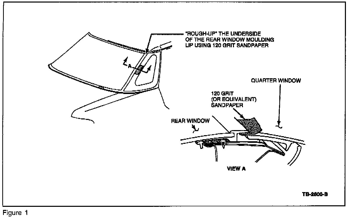 1. "Rough-up" the underside of the rear window moulding lip along the roof and pillars with 120 grit sandpaper, refer to Figure 1.