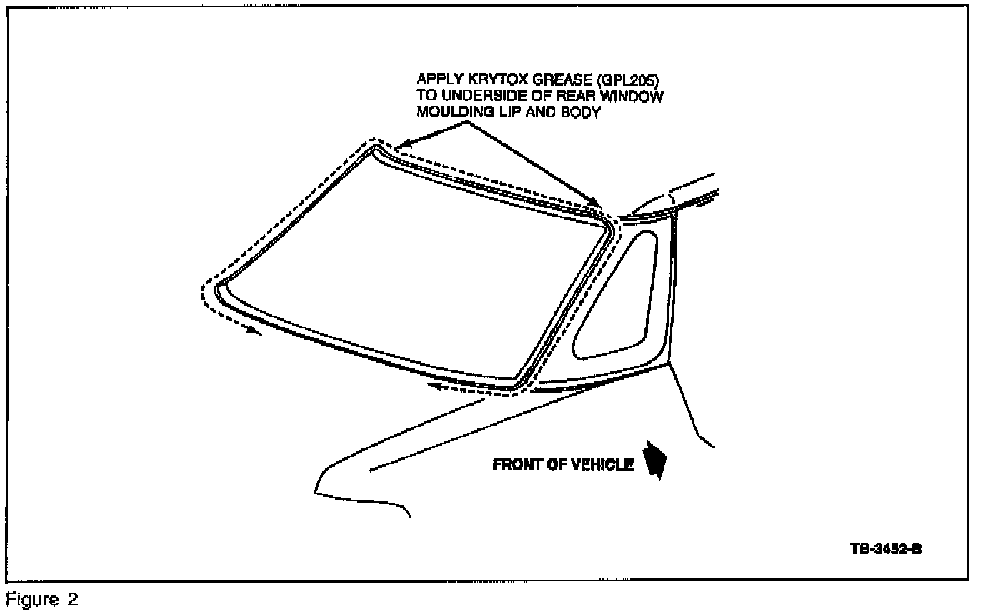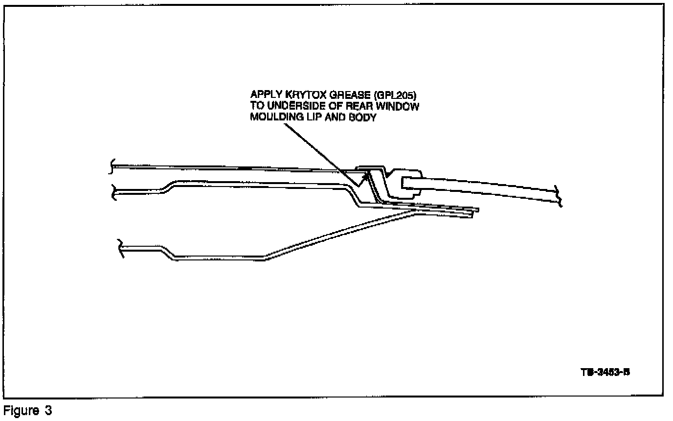 2. Apply Krytox GPL205 Grease along the entire underside of the rear window moulding lip. Apply between the painted surface of the roof and pillars, including the two (2) lower corners, using a plastic squeegee. Refer to Figures 2 and 3.