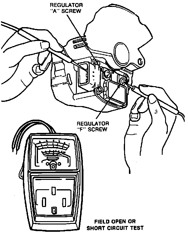 f. Place ignition switch in the ``Off'' position, then connect voltmeter positive lead first to the regulator ``A'' screw head and then to the regulator ``F'' screw head, Fig. 10.