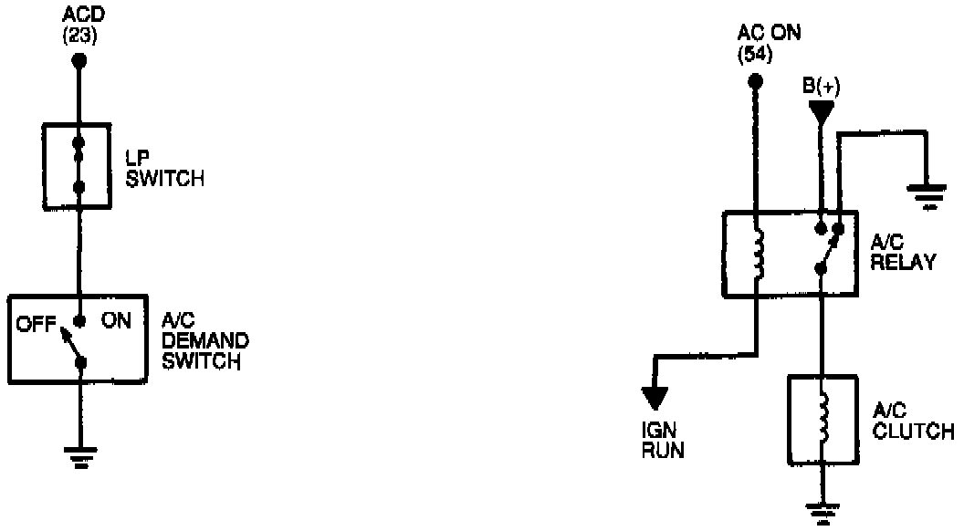 The WAC output (Pin 54) is used by the Powertrain Control Module (PCM) to disengage the A/C clutch when compressor operation is not desirable. Under normal conditions, with the A/C off, the PCM will ground the WAC output, which opens the normally closed WAC relay. When the A/C demand switch is turned on, and the cyclic pressure switch/low pressure switch is closed, voltage is supplied to the WAC relay contacts and to the ACC/S circuit (Pin 10). The voltage on the ACC/S circuit indicates to the PCM that A/C is requested. The PCM will then verify that A/C clutch operation is desirable (ex. engine not cranking or overheated, not at WOT, etc.) If A/C clutch operation is desirable the PCM will adjust idle speed as necessary and "unground" the WAC output, which closes the normally closed WAC relay and allows voltage to be supplied to the A/C clutch.