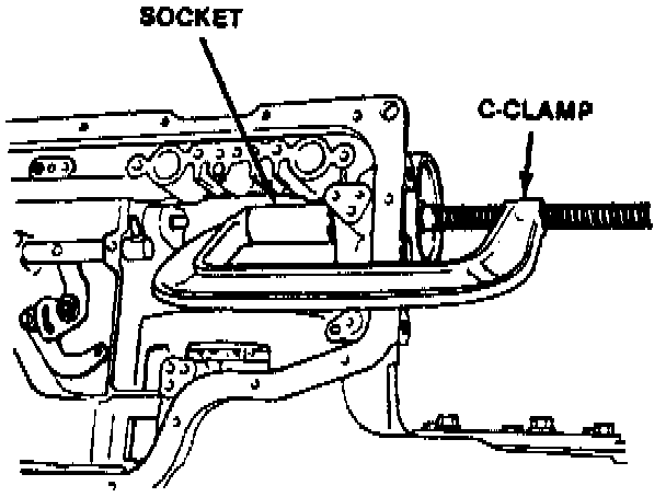 6. Using suitable C-clamp and socket, compress servo piston, then use suitable screwdriver, remove servo piston retaining snap ring.