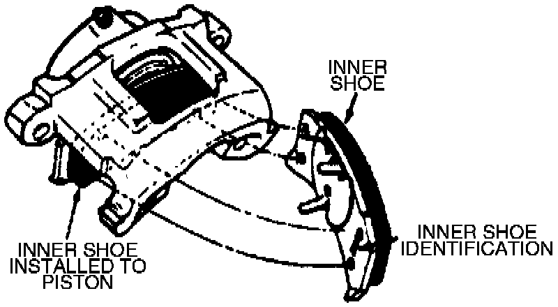 3. Install inner shoe and lining assembly on caliper piston. Some inner brake shoes are marked LH (lefthand) and RH (righthand) and must be installed on the proper caliper. Use care to not bend spring clips too far during installation in piston, otherwise distortion and rattles may result.