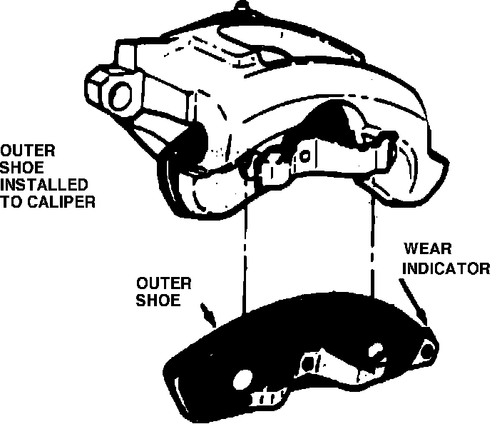 4. Install outer brake shoe and lining assembly. Ensure shoes are installed on proper caliper and clip and buttons on shoe are properly seated. Outer shoe can be identified as lefthand and righthand by wear indicator. Wear indicators must be installed toward front of vehicle.