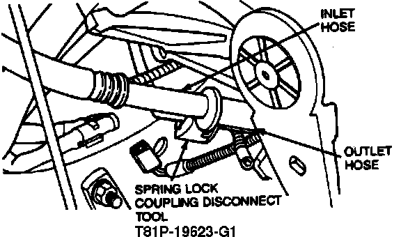 13. Using tool T81P-19623-G1, G2 or equivalent, remove A/C compressor inlet and outlet attaching hoses.