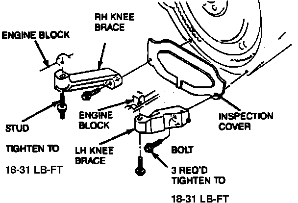 17. Remove transmission line bracket attaching nut, then remove engine to transmission knee braces attaching bolts and stud.