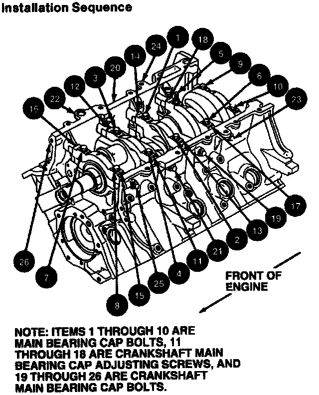 3. Tighten main bearing cap bolts in two steps as follows: Tighten main bearing cap bolts in sequence to 10 N.m (7 lb-ft).Tighten main bearing cap bolts in sequence to 19-23 N.m (14-17 lb-ft).
