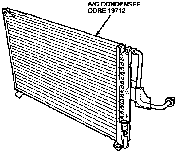 The A/C condenser core is an aluminum fin heat exchanger. It is located in front of the radiator. The A/C condenser core cools compressed refrigerant gas by allowing air to pass between its fins and tubes. As the refrigerant is cooled, it condenses to a liquid state.