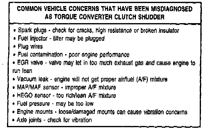 2. Verify concern. Torque converter shudder occurs during 3rd or 4th gear under light to moderate acceleration. If vibration or shudder occurs only in 1st or 2nd gear, or when brakes are applied, then it is not torque converter shudder.