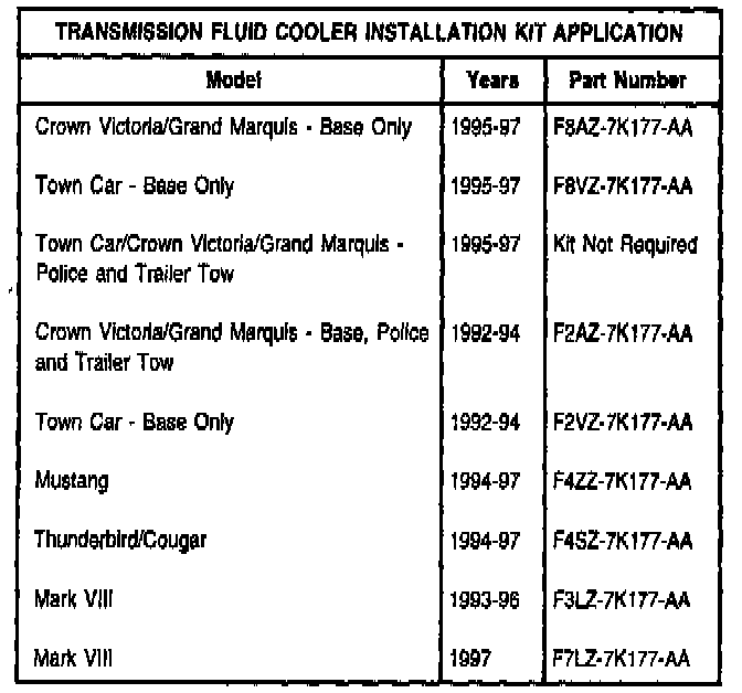 7. For vehicles operating in mostly stop-and-go traffic, areas of high ambient temperature and humidity or the previously listed states, install a new Transmission Fluid Cooler and Transmission Fluid Cooler Installation Kit (refer to the Transmission Fluid Cooler and Fluid Cooler Installation Kit Application Chart for correct part usage). Refer to the Instruction Sheet included with the installation kit for details.