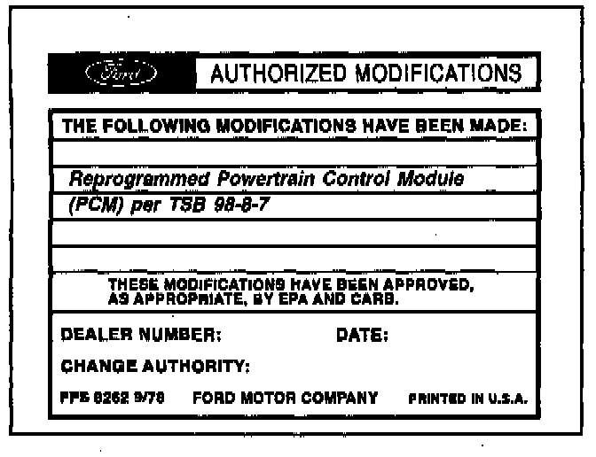 9. For all 1996-97 Town Car, Crown Victoria/Grand Marquis, Thunderbird/Cougar vehicles, check emissions decal to verify vehicle has the latest calibration. If it does not, reprogram the Powertrain Control Module (PCM) to the new calibration level using Service Bay Diagnostic System (SBDS) or New Generation Star (NGS) Tester with latest CD-ROM. Refer to the Recalibration Cross Reference Chart for the correct PCM calibration.