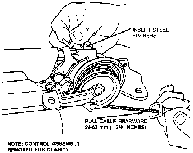 5. Insert a steel lockpin through holes in lever and parking brake control assembly. This locks ratchet wheel in the cable-released position.