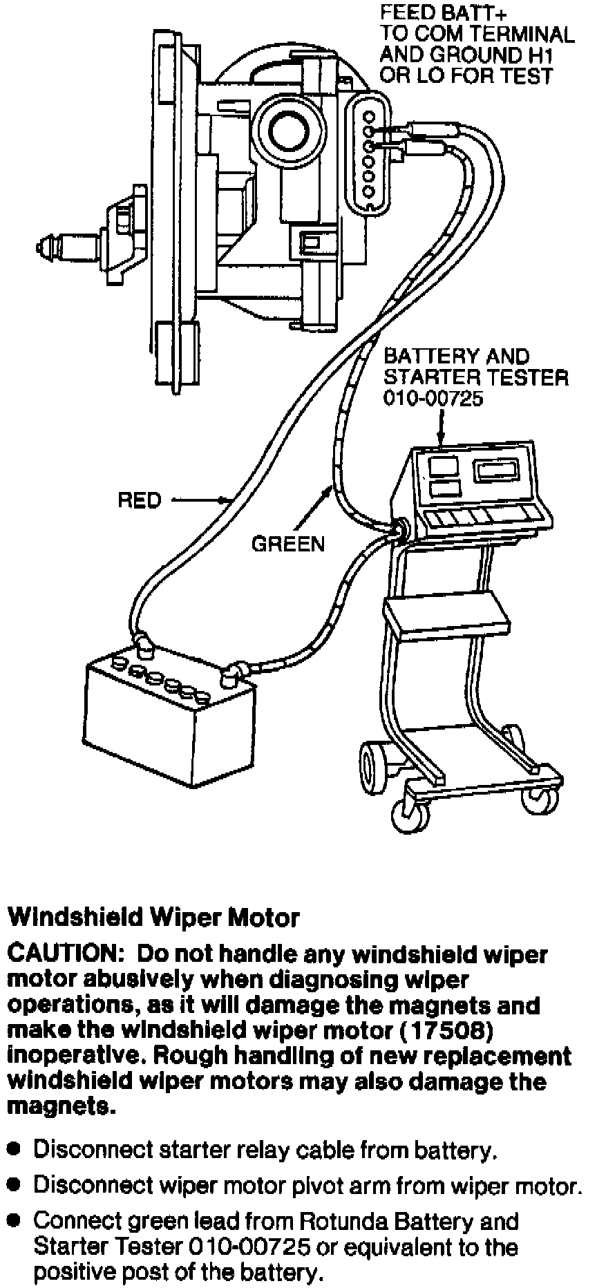 5. Connect green lead tester to battery positive. Connect a jumper wire from pin four of wiper motor to battery ground terminal.
