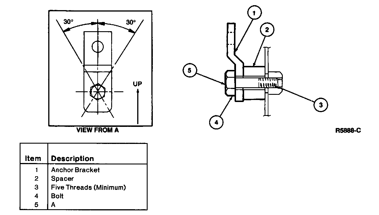 4. Install the 8 mm bolt provided with the child safety belt anchor tether, making sure that at least five threads engage in the panel. Be sure the anchor bracket is within a 30 degree angle as indicated. Tighten the child safety anchor tether bolt to 38-78 Nm (28-58 lb-ft).