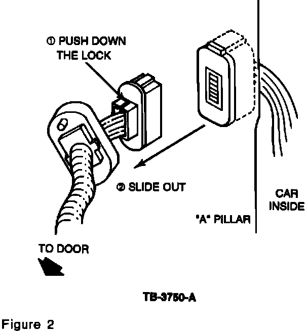 TO DISCONNECT THE SHELLS, PUSH DOWN THE LOCK LOCATED AT THE TOP OF THE CONNECTOR SHELL AND SLIDE OUT THE DOOR HARNESS SIDE SHELL. REFER TO FIGURE 2.