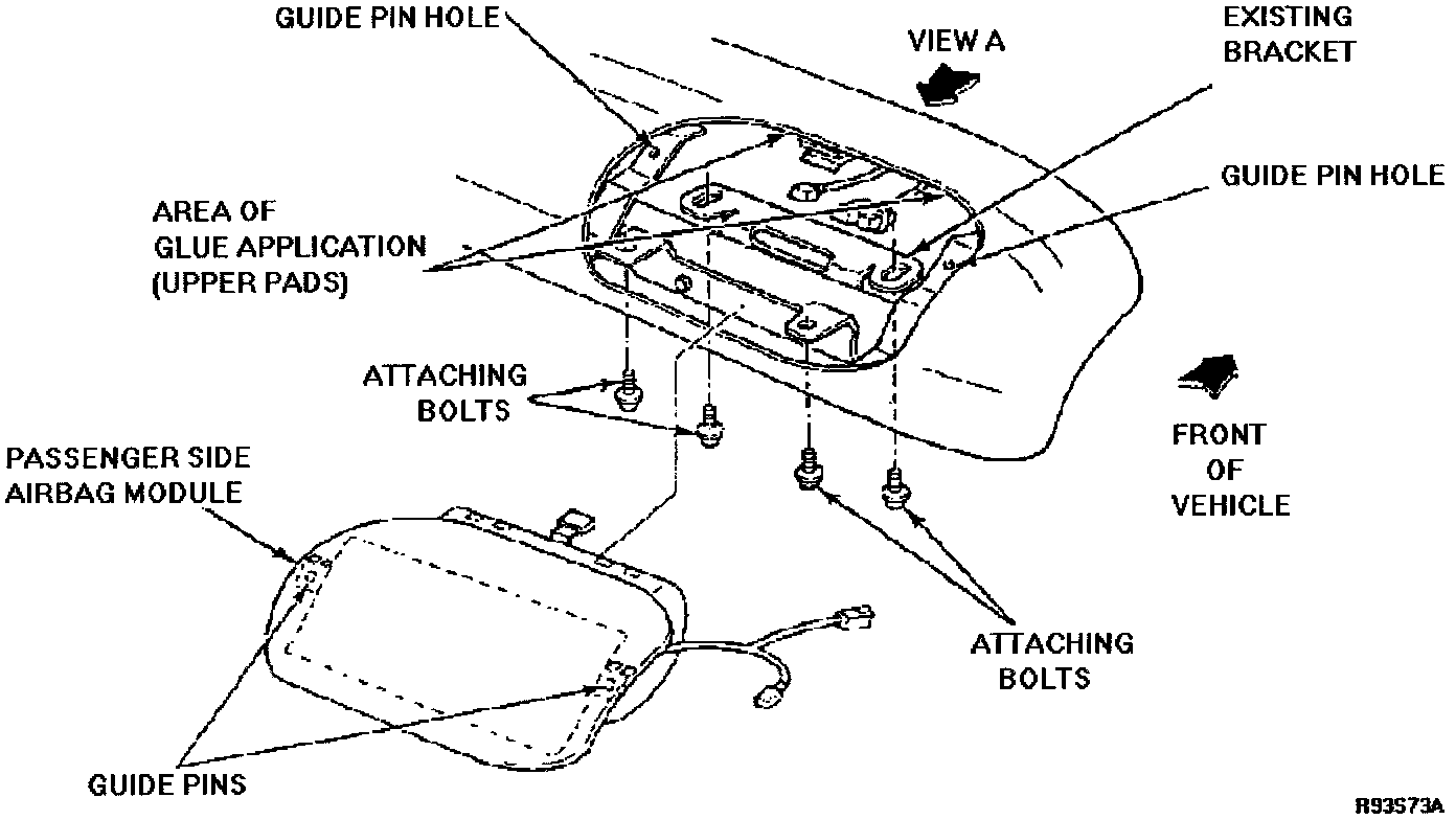 11. Remove the (2) 10 mm nuts which secure the existing airbag bracket. See View A (inset on Attachment III-A).
