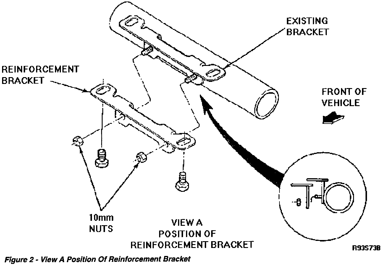 12. Install reinforcement bracket from kit behind existing bracket. DO NOT remove existing bracket.