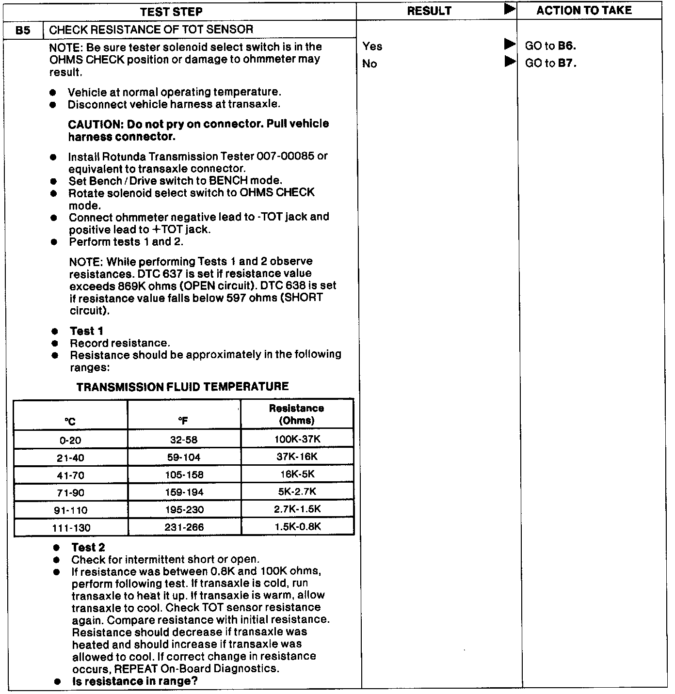 PINPOINT TEST B: DIAGNOSTIC TROUBLE CODES 636: TOT HIGHER/LOWER THAN EXPECTED, 637: TOT ABOVE MAX VOLTAGE /-40F INDICATED, 638: TOT BELOW MIN VOLTAGE /+290F INDICATED, 657: TRANSAXLE OVERTEMP CONDITION