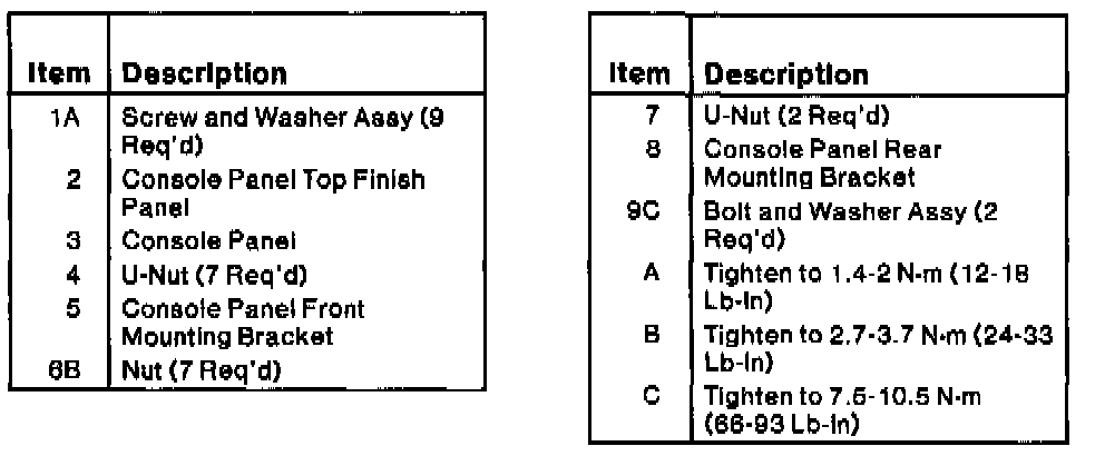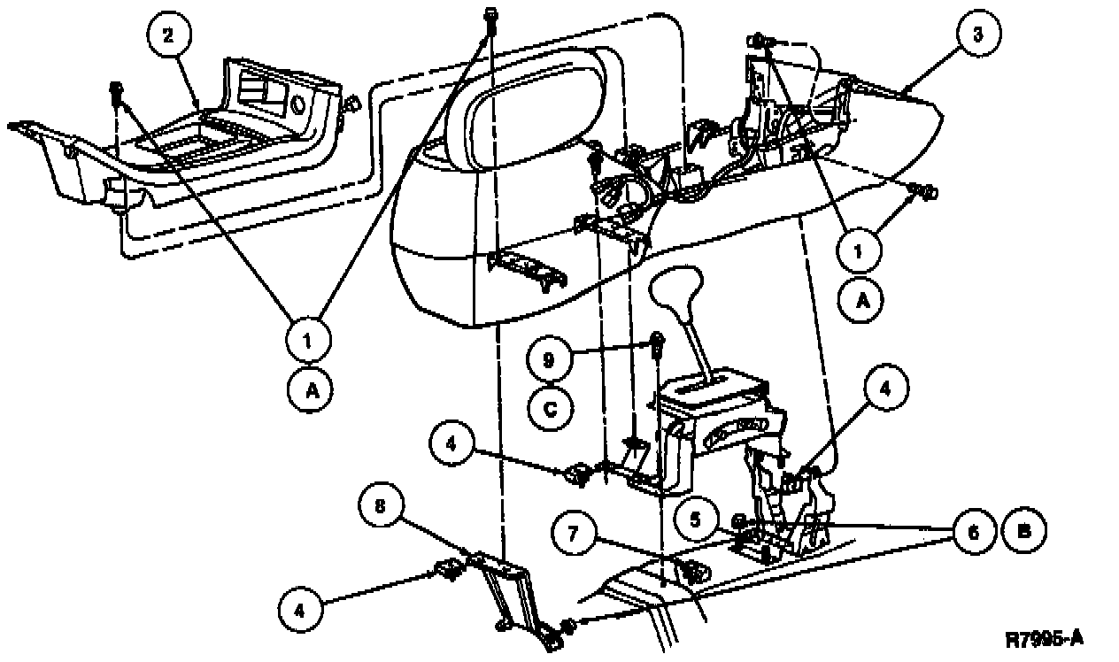 4. Remove eight console panel to console panel bracket retaining screws. The two rear screws are under the mat in the rear storage bin.