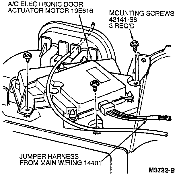 3. The temperature control knob (temperature adjustment potentiometer) which connects through an A/C electronic door actuator motor to the A/C air temperature control door of the heater air plenum chamber assembly by an A/C electronic door actuator motor. Movement of the control knob from COOL to WARM causes a corresponding movement on the A/C air temperature control door and determines the temperature that the system will maintain.