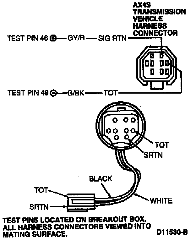 This view will be helpful for Pinpoint Test B as it identifies the Transaxle Oil Temperature (TOT) connections on the harness.