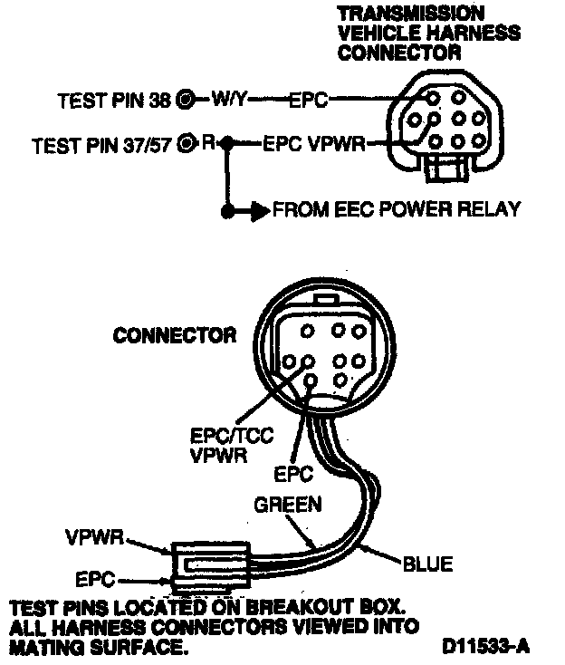 This view will be helpful for Pinpoint Test E as it identifies the Electronic Pressure Control (EPC) solenoid connections on the harness.