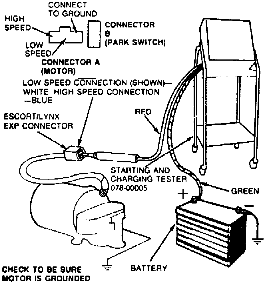 3. Make test connections as shown. Alternately connect red test lead to wiper motor low and high speed connectors.