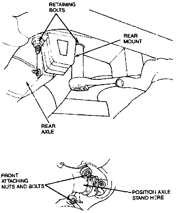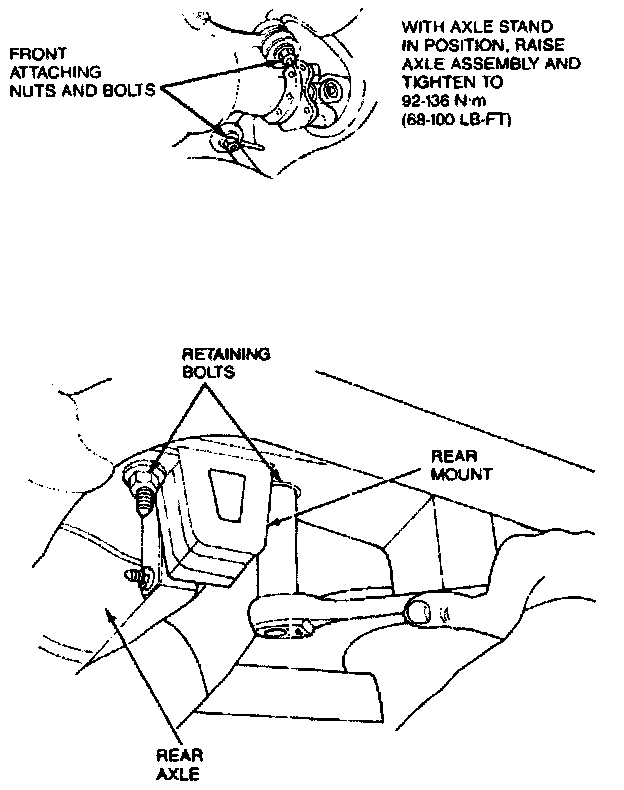11. Raise axle housing with axle stand and install bushings and retaining nuts, Tighten to 92-136 N.m (68-100 lb-ft). Remove axle stand.
