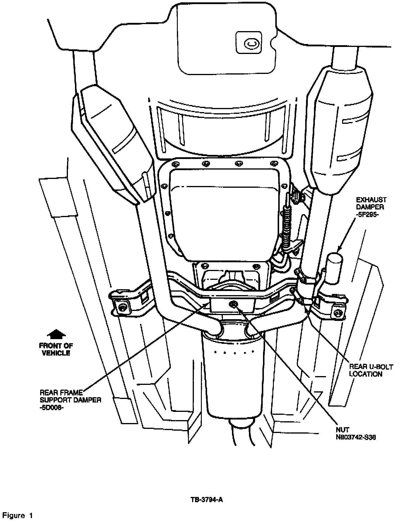 3. Install exhaust damper (F4SZ-5F240-A) on left hand (driver side) pipe between converter housing and bend in front of resonator (muffler). Refer to Figure 1 for location.